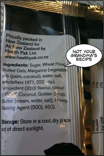 The Air NZ snacks are woeful. Even a smidgen of corporate social responsibility would ensure at least one healthy option. “Vegetable” snacks – how many veges actually died in concocting that product. Lollies – mmmm. Biscuit – I’m not sure where Grandma used to hide all those additives, flavouring, regulators and emulsifiers.